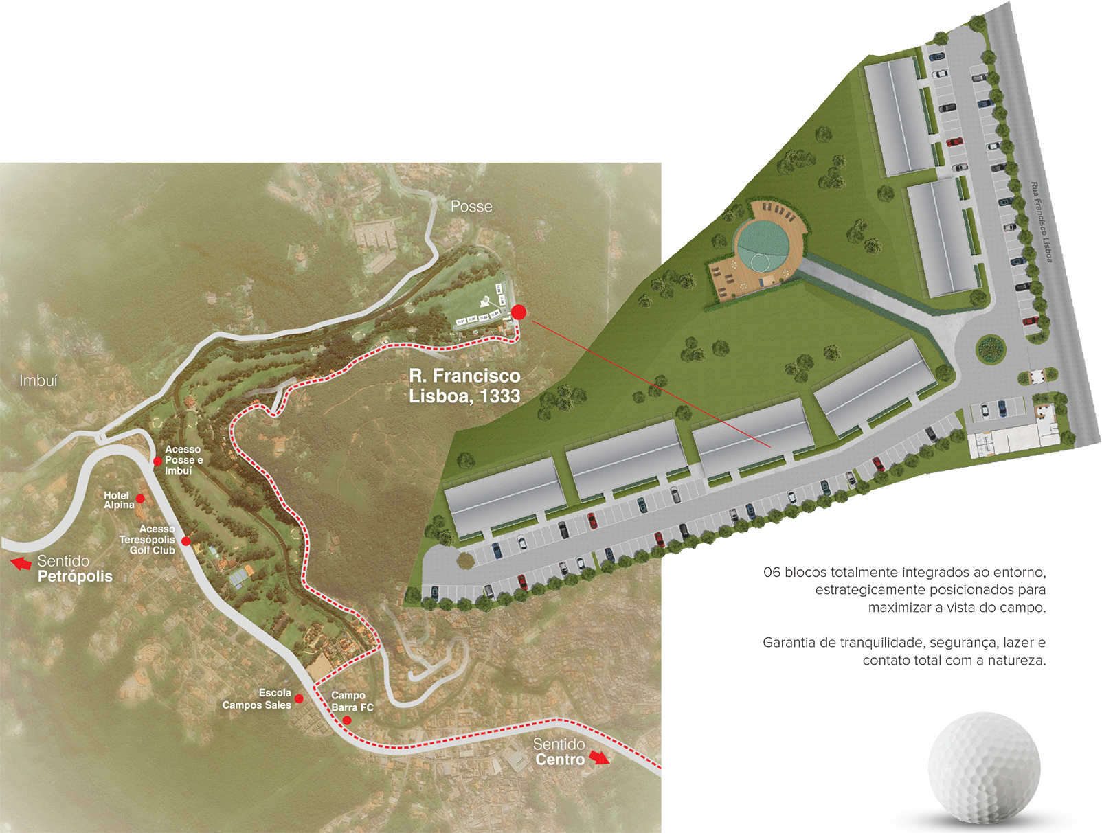 Localizado em Teresópolis, cidade conhecida por sua segurança e exuberância natural, o Golf Club Resort é composto por 06 blocos de 03 pavimentos. Todas as unidades têm vista privilegiada e seus moradores terão acesso exclusivo ao Teresópolis Golf Club.*